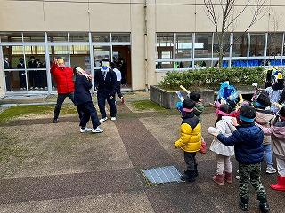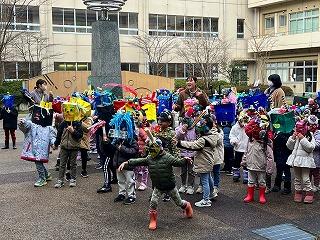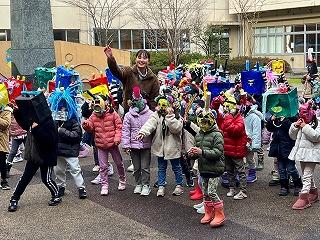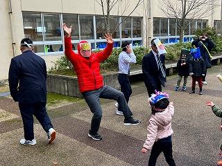 節分でもあり、鬼のお面をかぶって現れました。本校の1年生や茶谷先生も鬼のお面をかぶり、園児とふれあいました。