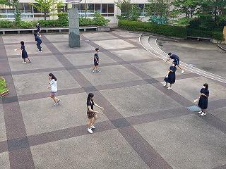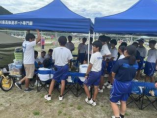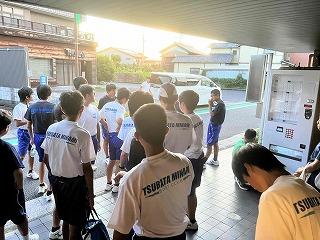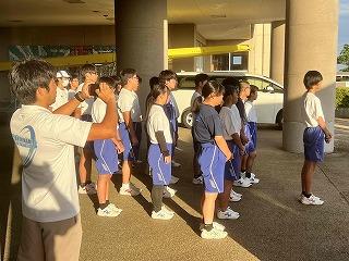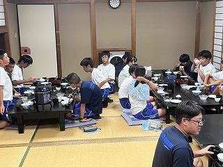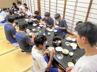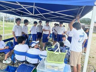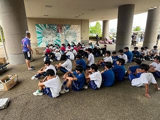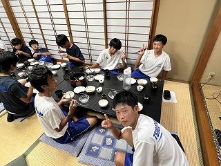 そこまでは良かったのですが、前日練習の準備を始めたところで、太陽が照り付け始め、気温も急上昇!熱中症にならないよう、こまめに水分補給をしながら全クルー練習に出て行きました。約一時間ほど練習し、昼前で練習を切り上げ、一度宿舎で休憩。