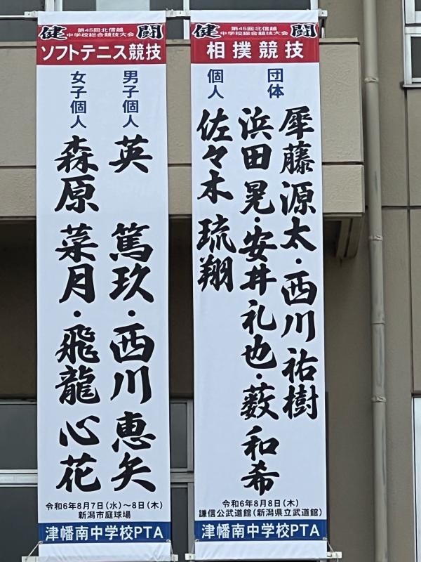 第45回北信越中学校体育大会に出場する、男女ソフトテニス部と相撲部を応援する懸垂幕ができ上がりました。