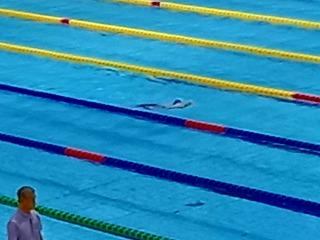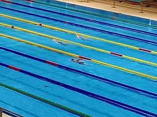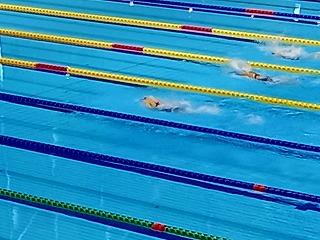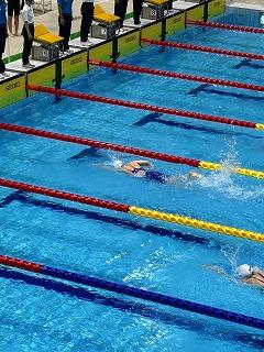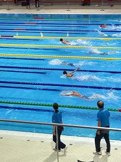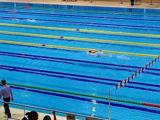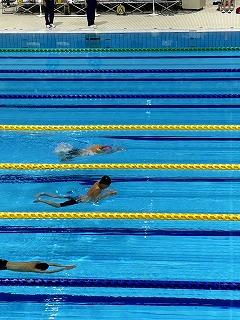 泳ぎ切っています。ペース配分を意識して、後半は暫定3位から一気にその組のレースの1位にのし上がり、2位と大差をつけてゴールです。