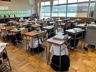 ①しゃがむ、②隠れる、③じっとする、を確認し、放送の指示で机の下等安全な場所で身を守りました。