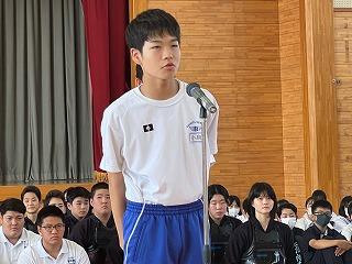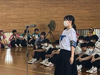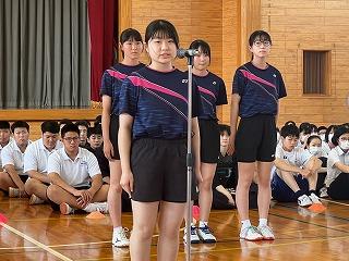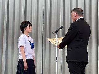 表彰披露のあと、石川県体育大会スローガンの部において、3年生の谷川瑞季さんの作品が応募総数6000余りの作品総数の中から最優秀作品に選ばれ、石川県中体連体育連盟の大茂 勝 会長より表彰されました。