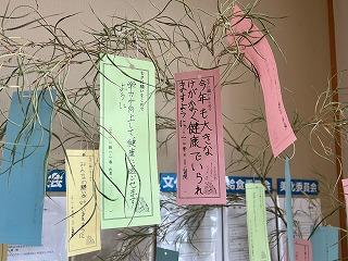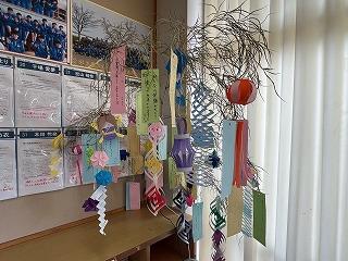 2年生の教室には、七夕の飾り付けがされ、願い事が書かれた短冊が結ばれて飾られています。