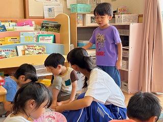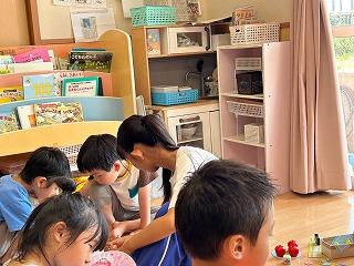 ちいろばこども園でのボランティアでは、園児の遊びのサポートをしたり、好きなお話を聞いたりしながら、子どもの成長のお手伝いをしています。お昼も一緒に食べました。