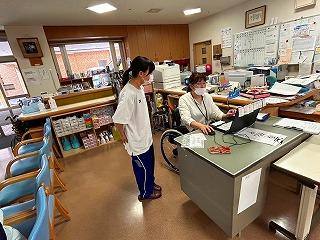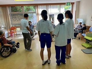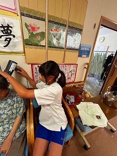あがたの里では、利用者の方々とお話をしたり、リハビリやドライヤーのお手伝いをさせていただきました。