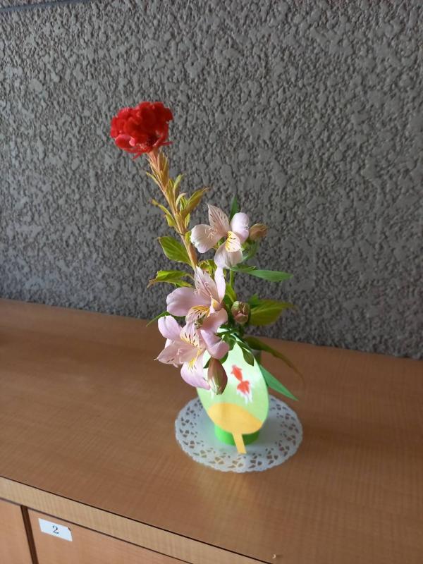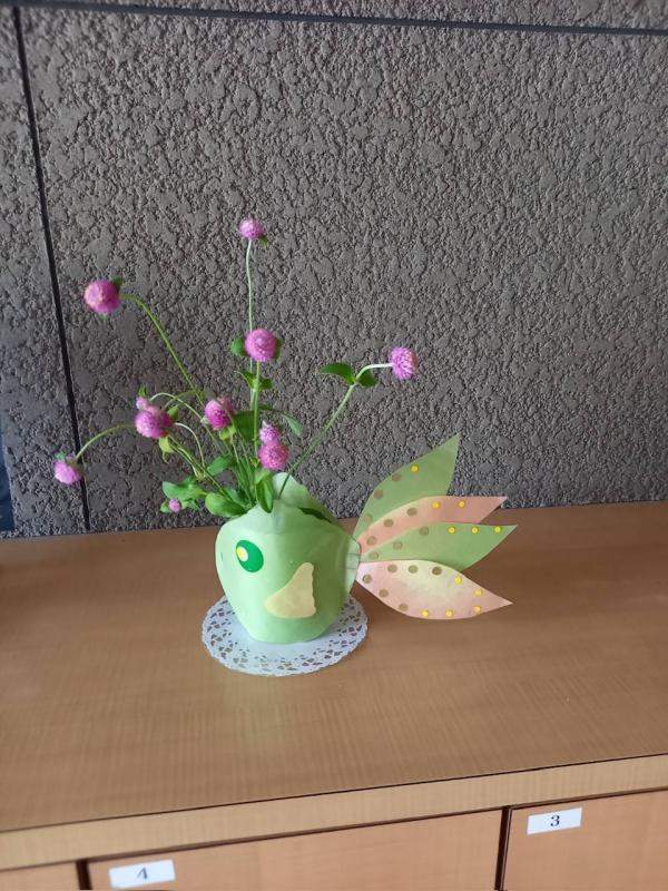 夏休みでも勤務されている先生方のために、と、金魚や団扇の飾り付けの付いた手作りの花器を持ってきて、花を生けてくださいました。