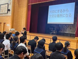 「結婚式では何を着ていく?」という質問に始まり、「T POを意識した生活をしよう」という今月の生活目標に繋げるお話でした。「大切にするから大切な場所になる」という北村先生の言葉が印象的でした。