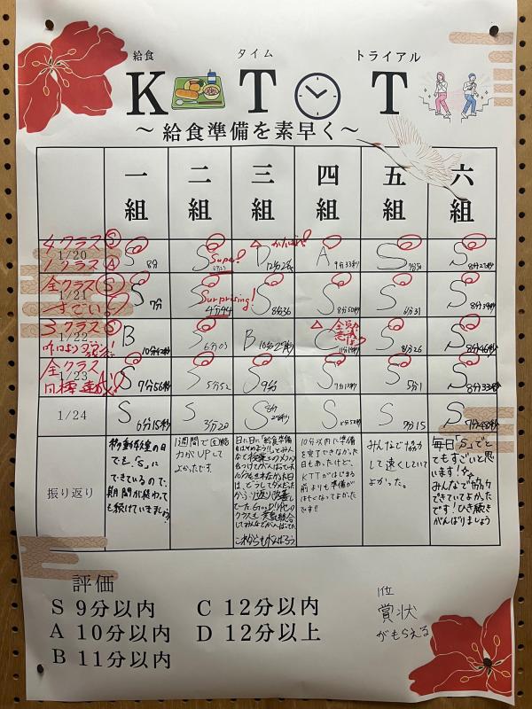 1年生のプログラム委員会では、1月の取り組みとして、KTT(給食タイムトライアル)を行いました。