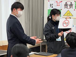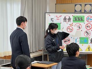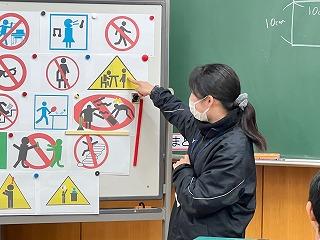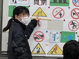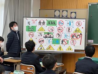 本日は、1年2組の生徒たちが考えたピクトグラムの中から、担任の廣瀨先生、星野先生、教頭が良いと思われるものを選びました。生徒たちはピクトグラムの説明をしながら、自分たちの思いを発表しました。