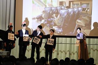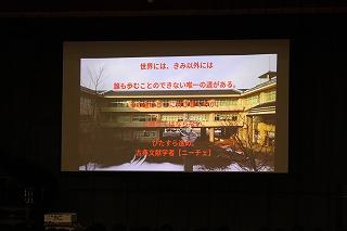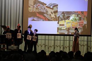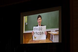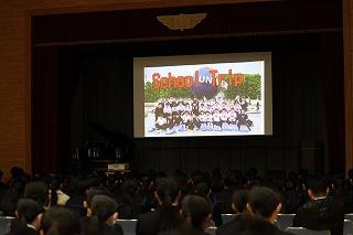 3年生の3年間の思い出のスライドショーが上映された後、修学旅行の一コマをモチーフにした1、2年生による劇が行われました。その後、異動された先生方によるメッセージが流され、3年生たちも感慨深げに見入っていました。