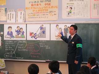 署員の方が、いじめについてのイラストを使って問いかけをして、