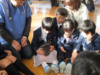 本日、5限目に、本校プレールームにて、1年生の動物ふれあい教室を開催しました。
