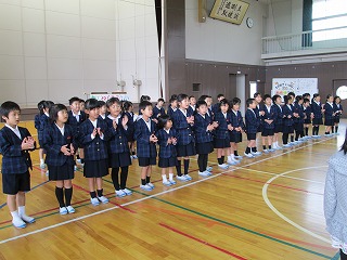 鶴ヶ丘小学校の校歌も演奏していただき、全員大きな声で歌いました。