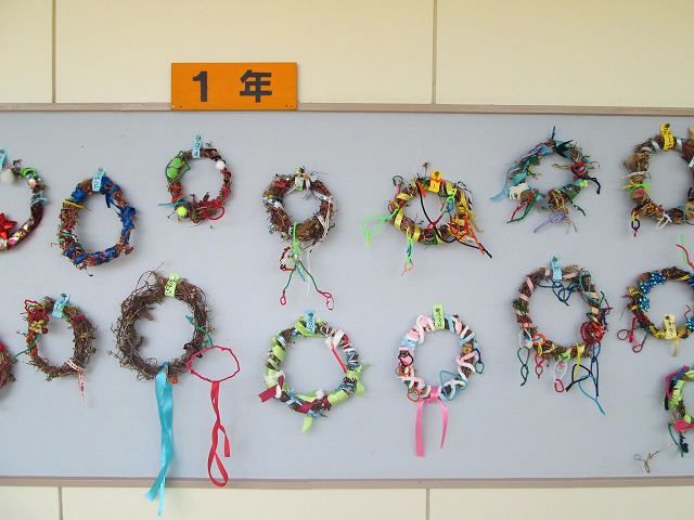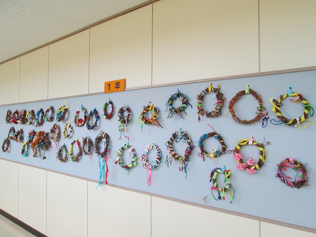 先生や子どもたちが廊下を通るたびに、たくさん並んだリースを見て楽しい気持ちになります。