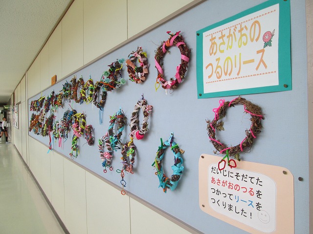 1年生が、5月から大切に育ててきたあさがおのつるを使って、リースを作りました。