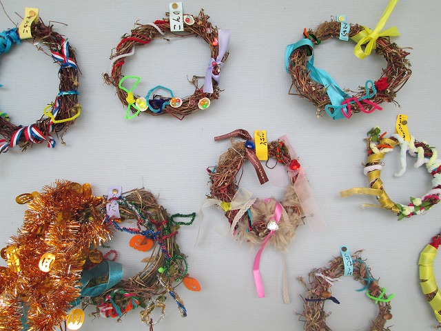 友だち同士 みんなで協力し合って、束ねたつるを円くして、リボンなどいっぱい飾りをつけて、素敵なリースができあがりました。