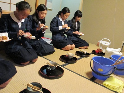 子どもたちはきちんと正座して並び、先生からお手前の作法を一通り教わってから、美味しいお菓子とお茶をいただきました。