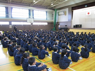 子どもたちは、校長先生のお話を真剣に聞き、大きな声で返事をしていました。