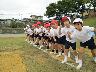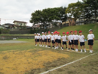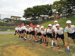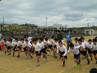 準備運動も入念に。 5年生男子。堂々たるスタートダッシュ!