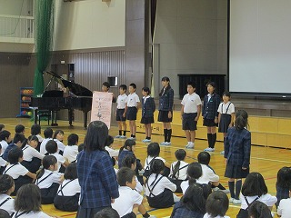 そのあと、後期の代表委員・各委員会の委員長が、みんなの前に出て めあてについての説明をしました。