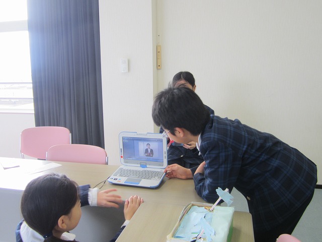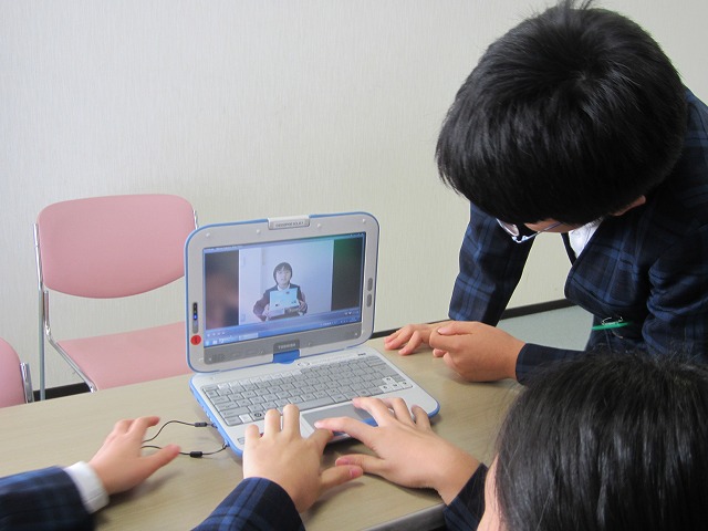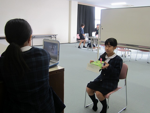 タブレットPCは動画撮影をすることができます。そこで、自分たちの作った作品を紹介するVTRを作ることにしました。お互いに撮り合っていたのですが、なかなかうまく話せず、何度も撮影し直している子もいました。やっとできあがった動画は、通知表渡しの際、教室前で再生させていただきました。