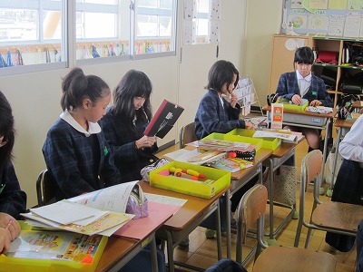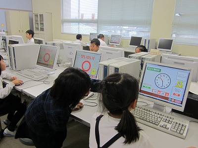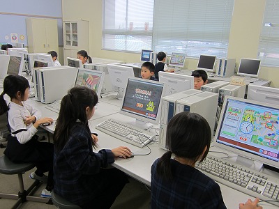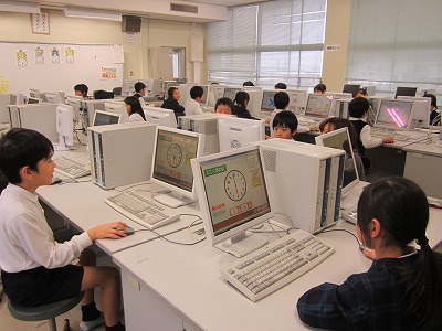時計の読み方が苦手な子が多い2年生。そこで、学習探険ナビの「じこくあわせ」「ワンタのよていひょう」を使って復習することにしました。ふだんから、タブレットPCはよく使っているのですが、パソコンを使うのは初めてです。まず、パソコン室のルールを勉強した後、マウスの使い方を覚えました。「ワンタのよていひょう」は登場人物それぞれにストーリーがあり、子供たちも親しみを持って、学習できたようです。ちなみにマウスの使い方はバッチリ!!パソコンもタブレットPCも両方上手に使えるように頑張っていきます。