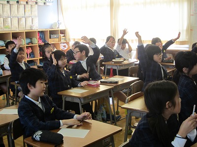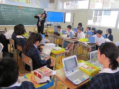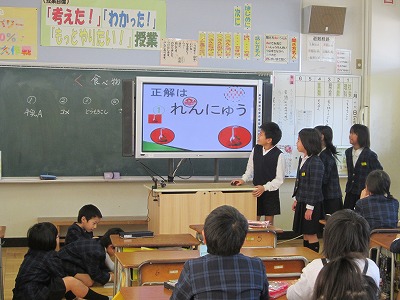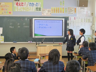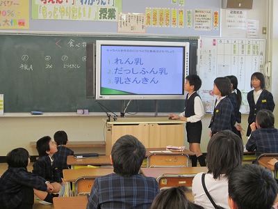 題材は「牛乳」「魚」「とうもろこし」など。これらの食べ物が何に変身するのかな?というテーマでクイズを考えました。一人一人頑張って作成してきたPower Pointを使ってのスライド。先日、班ごとに発表をしました。