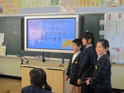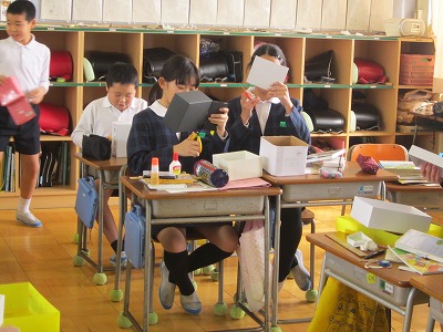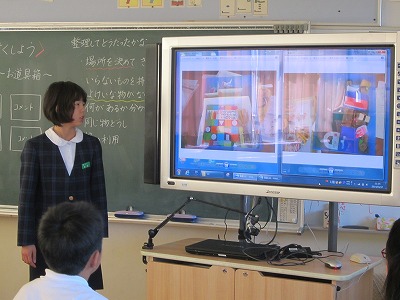 まず、片付ける前の道具箱の写真を撮り、片付けた後の写真も撮りました。仕切りなどは空き箱を使って工夫しました。最後に電子黒板にビフォアー&アフターの写真を映して、一人一人工夫した点などを発表し合いました。