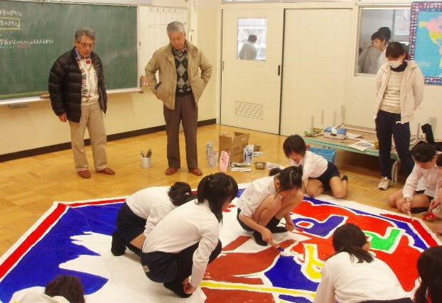 地域のたこの先生の指導を受けています。松川先生と竹津先生です。この後骨をつけて下さり、糸をつける作業をしていただきます。