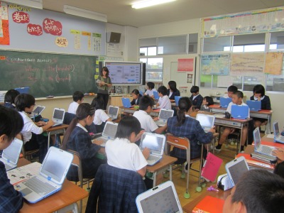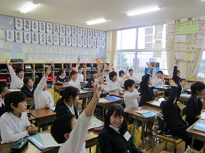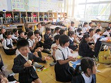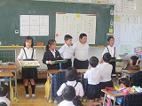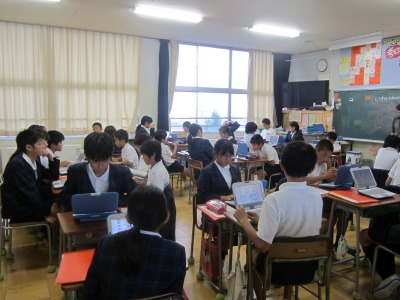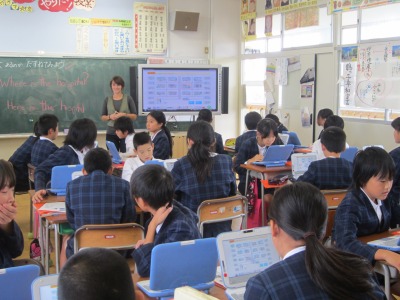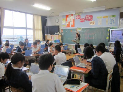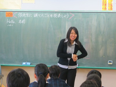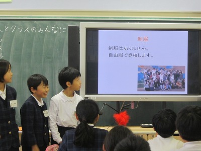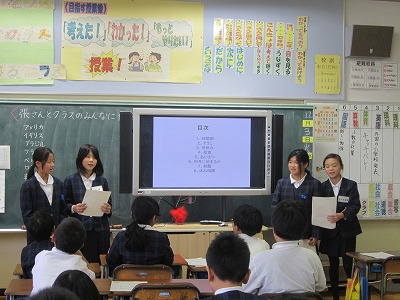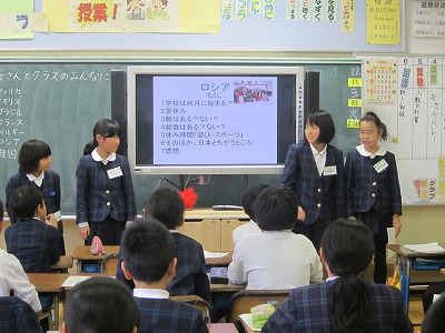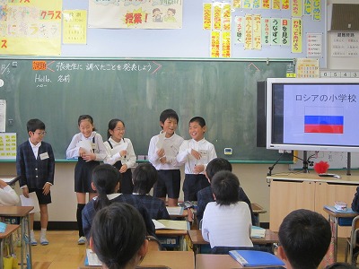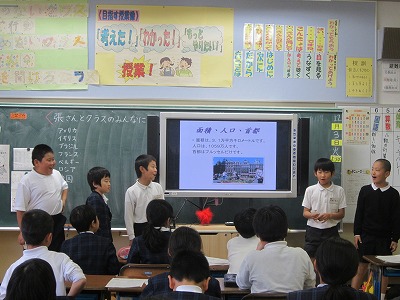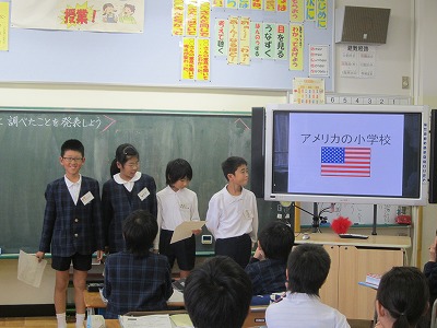 国際理解の学習で、世界の小学校について調べました。グループごとにプレゼンを作成し、国際交流員の張さんに見てもらいながら英語で発表しました。緊張しているグループもありましたが、パフォーマンスを工夫して堂々と発表しているグループもありました。