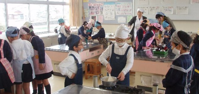 今日は内灘中学校の沢野井先生(栄養教諭)をゲストティーチャーにお呼びして作り方を教えていただきました。豆乳がかたまって豆腐になりました。おいしさは・・・GOOD