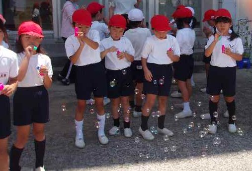 校長室で仕事をしていると、開け放してあるろうかがわのとびらから「シャボン玉」ふわふわと部屋に入ってくるではありませんか。外からは「校長先生の部屋にいれちゃえ」という声が聞こえてきました。部屋から出てみると1年生が生活科の学習でシャボン玉遊びをしていました。大きくつくる子、細かいのをたくさんつくる子、みんな楽しそうに活動していました。