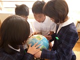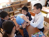 地球儀で、大陸や、4年生のときに国際交流で発表をした国がどこにあるかを
