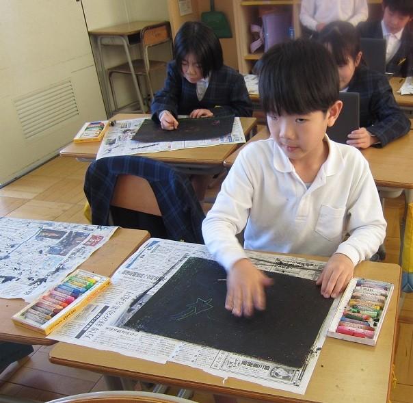 今日は作品を完成させる日でした。手が真っ黒になるまで夢中になって描いた作品がどんどん黒板に掲示されていきました。