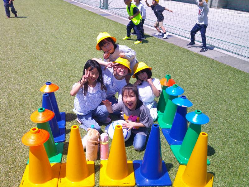 海賊公園では巨大遊具で自由遊びをしました。広い競技場ではボール投げ遊び、芝生で転がり遊び、カラーコーンで家づくりなど遊びを創造して楽しみました。