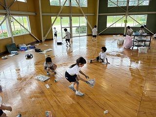勉強のあとはみんなで水拭きをしました。掃除も子どもたちにとっては楽しい時間だったようです。