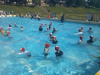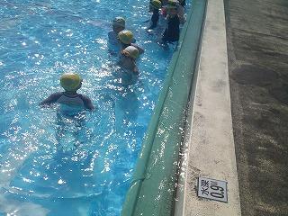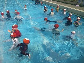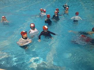 1限目は、1,2年生が服を着たまま水に入る体験を行いました。普段と違って動きにくいことや服の間に空気が入り膨らむことなどを体験しました。