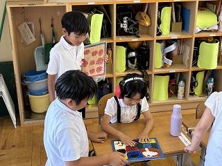 1年生は、大切に育ててきたアサガオのクイズをタブレットを使って出題しました。また、5年生は図工の時間に作ったジグソーパズルを1年生に楽しんでもらいました。