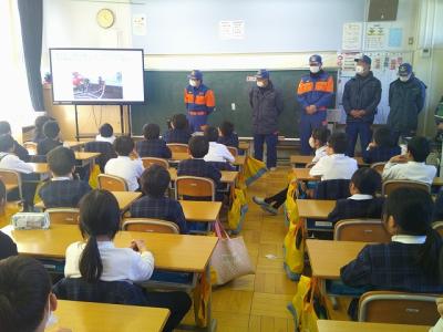 内灘町消防団の方をお招きして消防について学習をしました。先日の消防署見学に続いての「火事から命を守る」学習です。