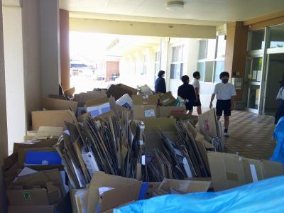 今日はその資源回収に向けて,学校にたまったダンボールや用紙などの再生資源を,6年生に玄関先まで運び出してもらいました。