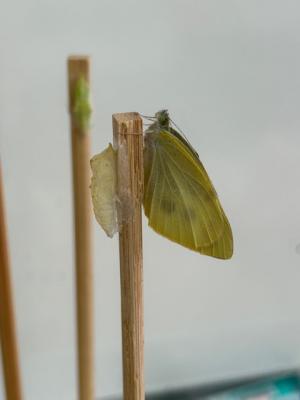 そのさなぎの内の一匹が今日羽化しました。羽が開くまで数時間かかったのですが,元気に飛び立っていきました。まださなぎがいますので,この後が楽しみです。
