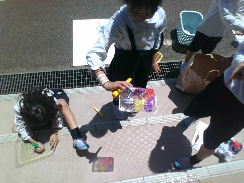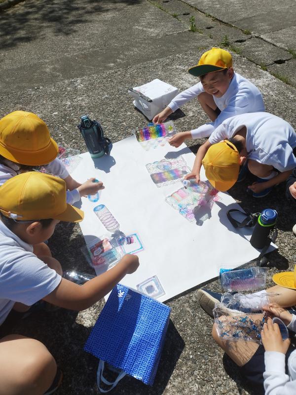 「ひかりのプレゼント」では、子どもたちが家から持ってきた透明容器に色をぬり、太陽の光に通してみる活動をしました。