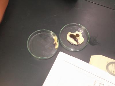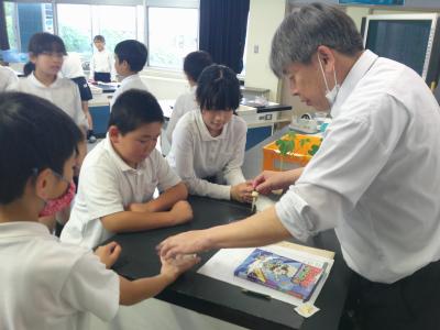 植物の養分を調べる学習で、ジャガイモから作られているポテトチップスにヨウ素液を付け、色が変わるかを調べました。ポテトチップスの色が変わるという結果にびっくりしていた子どもたち。この後、発芽には養分が使われているかどうかを調べる学習をしました。