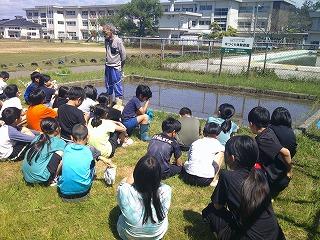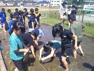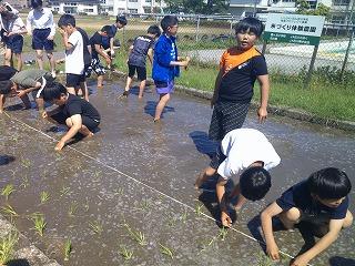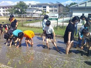 5年生が総合的な学習の時間、プール横の学校田で田植えをしました。
