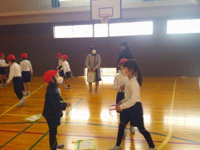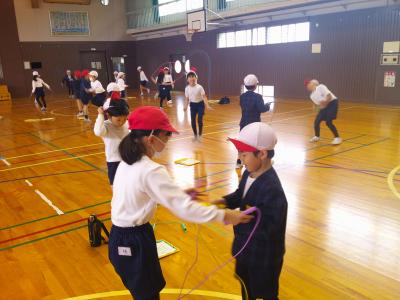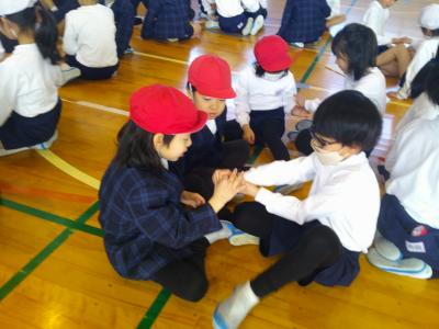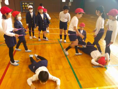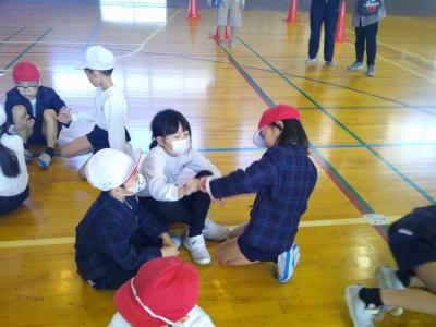 2年生が国語科「おにごっこ」の学習で調べた「三色おに」や、「ゆびのわずもう」の遊びを通して、1年生と交流しました。
