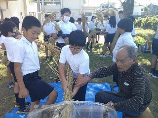ひと通り脱穀が終わった後には、全員で落ち穂を拾って、一粒残らず収穫できるように協力してお米を集めていました。昔の農家の方の苦労を感じながらも楽しい学習になったようです。