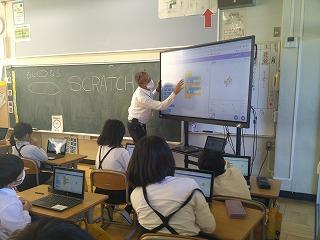 内灘町ICT指導教員による学習で、「スクラッチ」を使い、キャラクターの動きを考える活動に取り組みました。