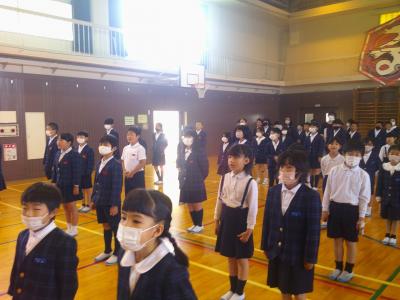 今年度初めての全校集会でしたが、並び方も姿勢もいい子がたくさんいました。次回の「全校集会」もみんなの姿勢や聞き方がレベルアップしてほしいと思います。