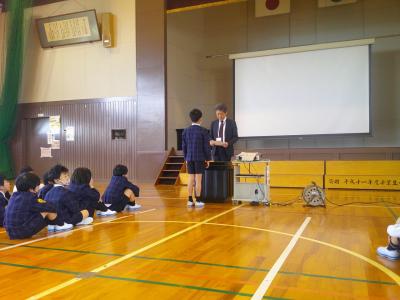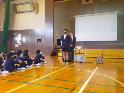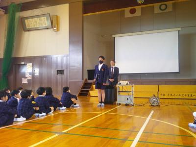 元気に校歌を歌った後、校長先生からは「コツコツ」の話、北川先生からは「あいさつ」の話がありました。みんなとても真剣に話を聞いていました。