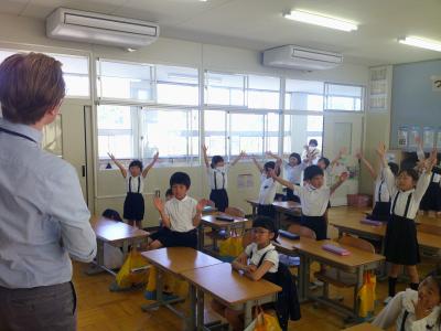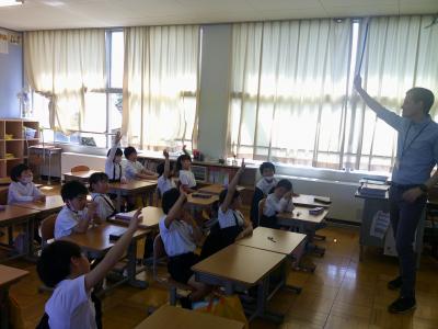5年外国語科で、ALTのローワン先生、ベンジャミン先生、そしてCIRのジェイク先生を招いて自己紹介の学習をしました。